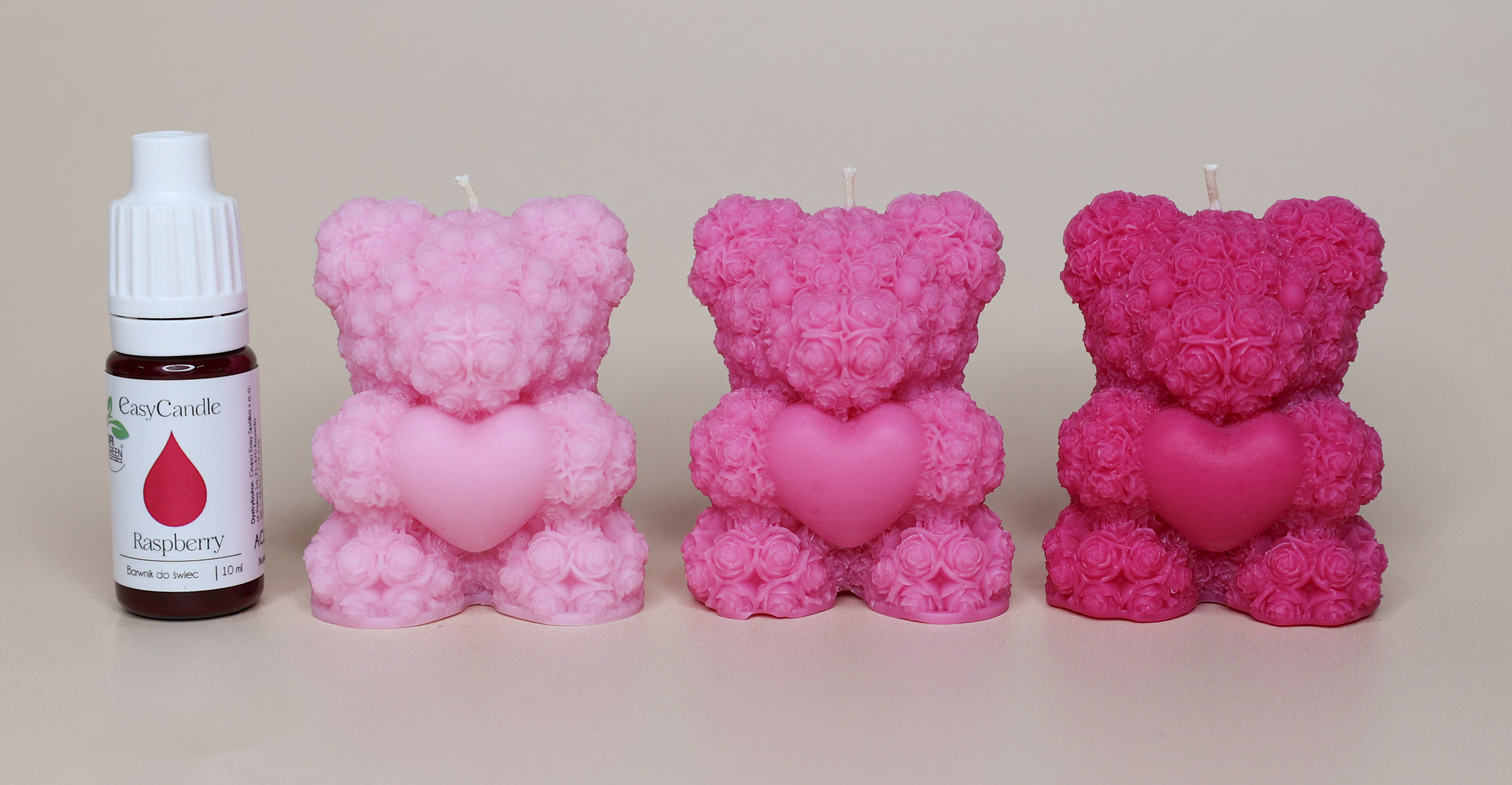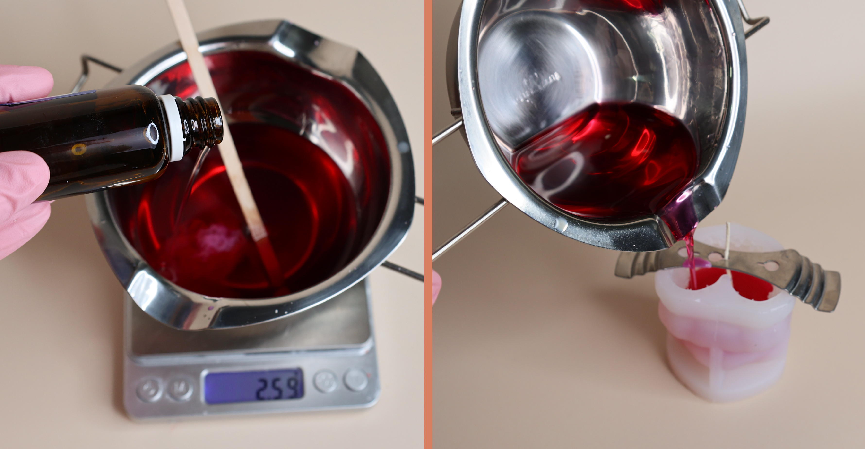 Barwnik w płynie należy odmierzyć na wadze jubilerskiej, w taki sam sposób jak olejek zapachowy. Na zdjęciu poniżej, do 60 g wosku użyliśmy: 2 krople, 5 kropli oraz 10 kropli barwnika ACL2 w kolorze Raspberry.