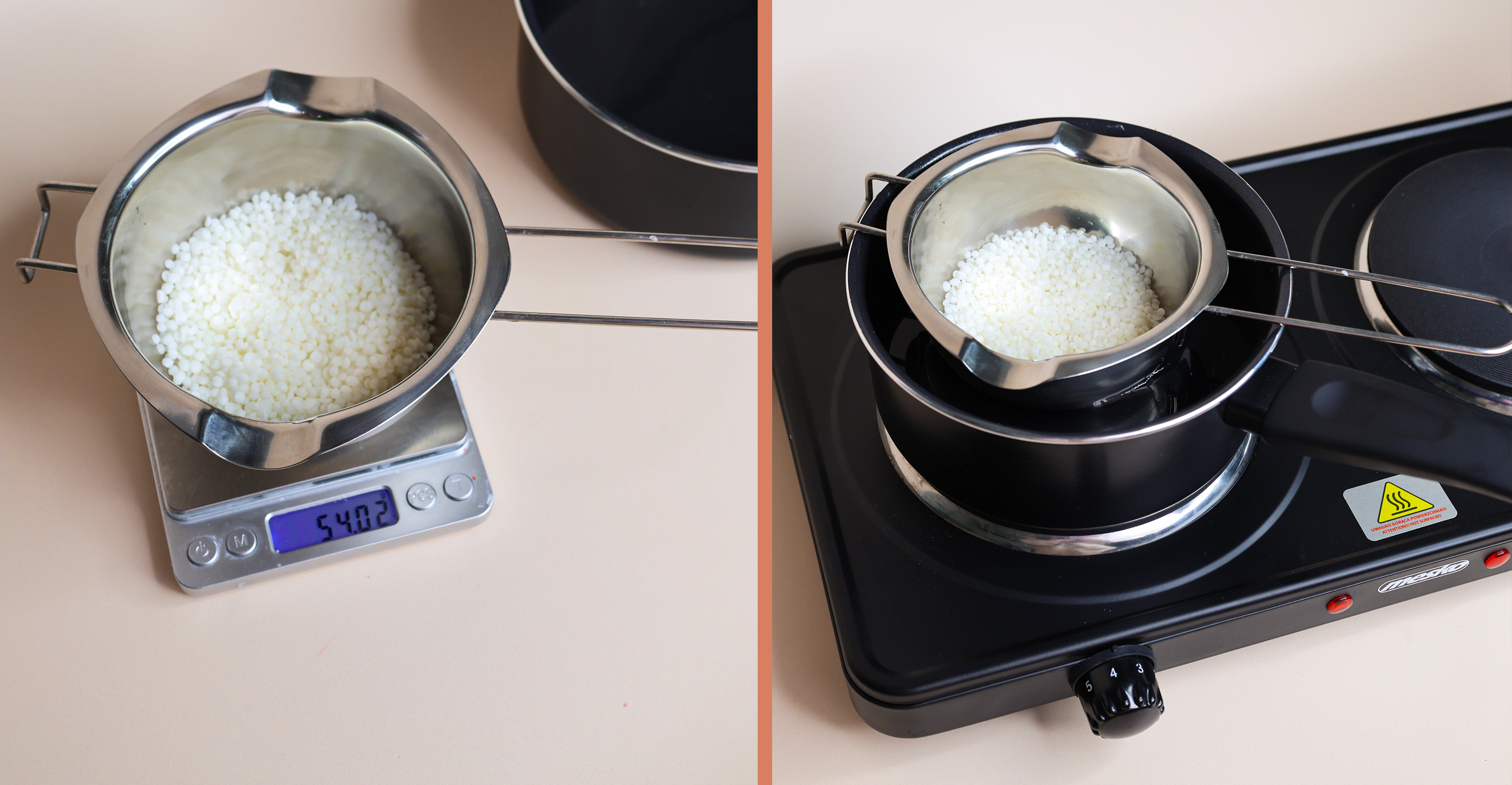 Upewnij się jeszcze raz, że forma stoi na stabilnej i idealnie równej powierzchni. Gdy wosk osiągnie około 70°C, delikatnie przelej go do formy.