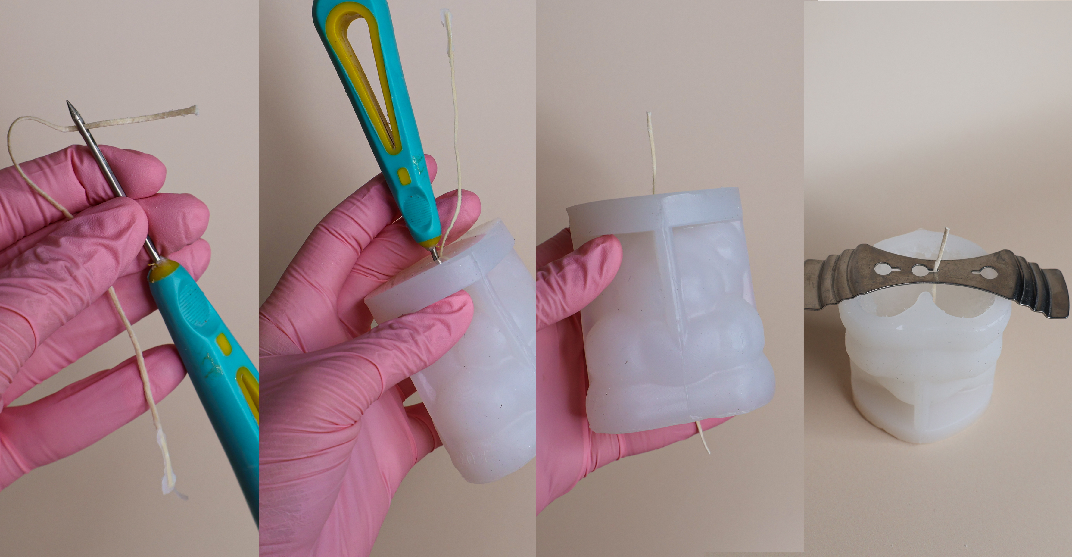 Czas przejść do zalewania formy! Na tym etapie możesz delikatnie podgrzać silikonową formę opalarką lub w piekarniku, aby ograniczyć ryzyko powstawania nierówności na powierzchni świecy - jednak nie jest to konieczne.