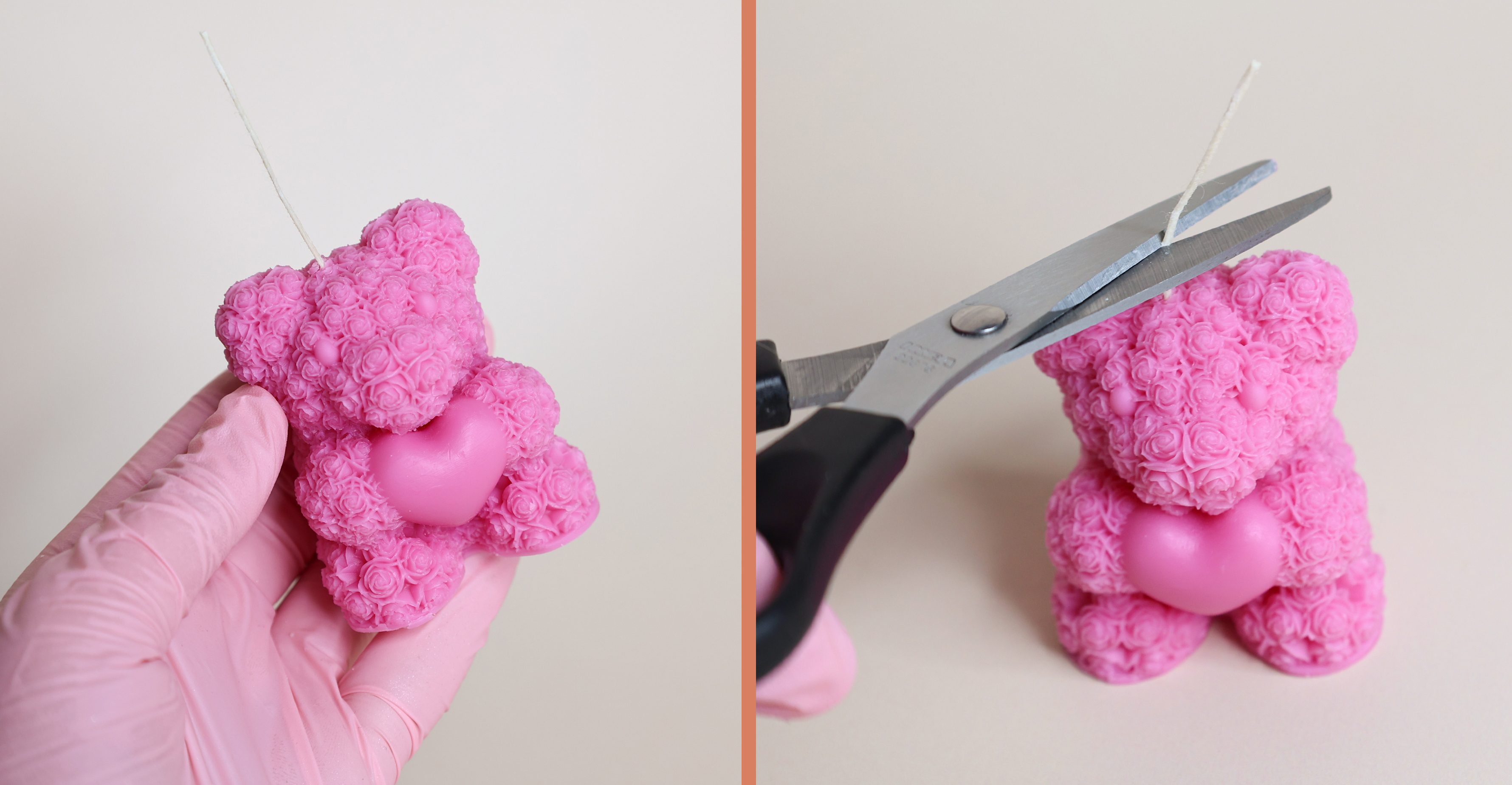 Załóż silikonowe rękawiczki, a następnie spryskaj wnętrze formy silikonem w sprayu i dokładnie rozprowadź go palcami, aby ułatwić późniejsze wyjęcie świecy.