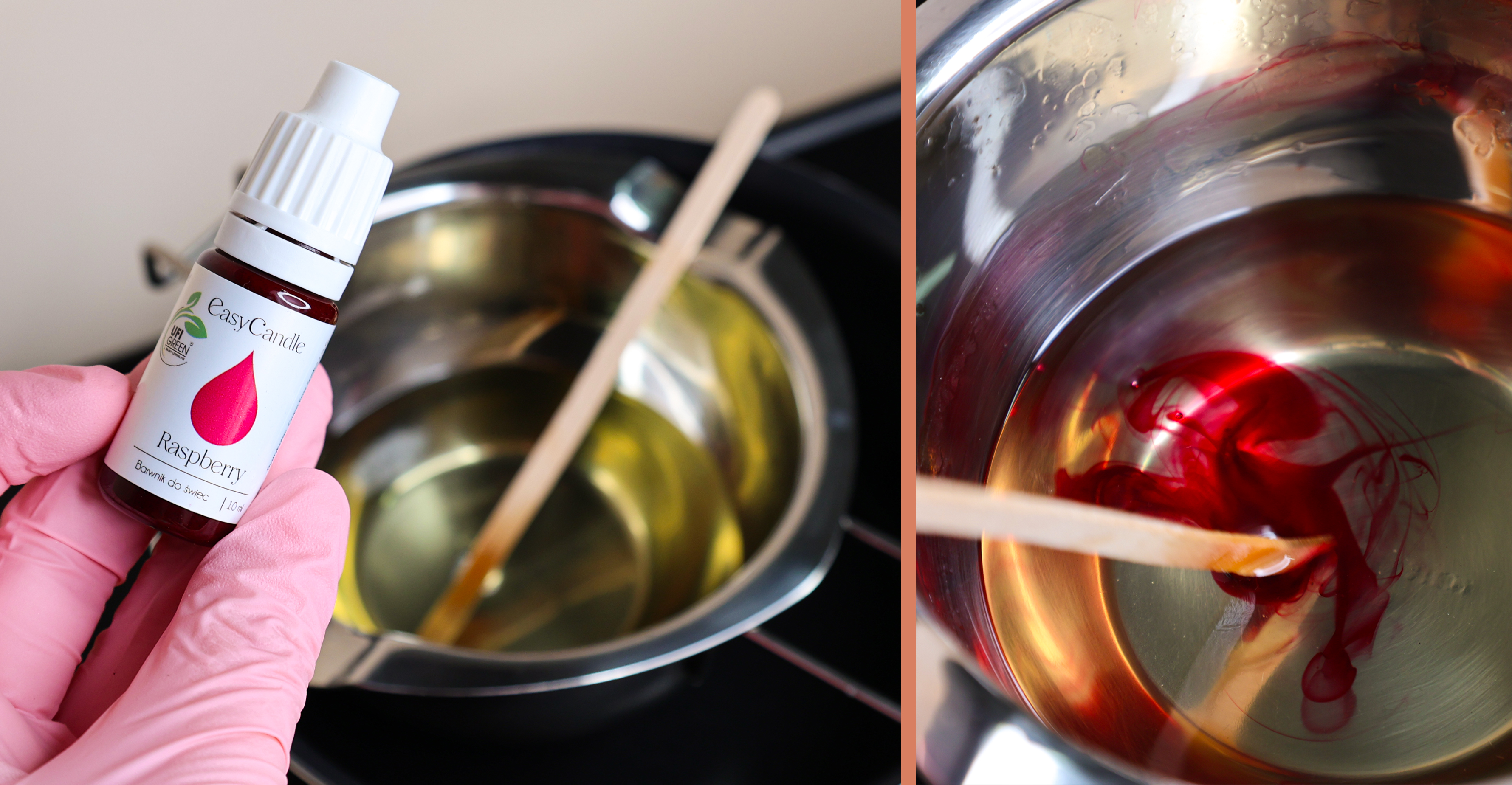 Jeżeli chcesz aby Twoja świeca była kolorowa, dodaj odrobinę barwnika w trakcie kąpieli wodnej. My użyjemy barwnika płynnego ACL 2. Pamiętaj, żeby nie przesadzać z jego ilością. Zbyt duże stężenie barwnika to jeden z najczęstszych powodów złego wypalania świecy. Zacznij od naprawdę małej ilości 1-2 krople. Dodaj odrobinę barwnika do wosku i dokładnie wymieszaj. Aby sprawdzić, czy odcień Ci odpowiada, upuść kroplę wosku na ręcznik papierowy i odczekaj chwilę. Jeżeli kolor jest zbyt delikatny albo po prostu Ci nie odpowiada, dodaj odrobinę więcej.