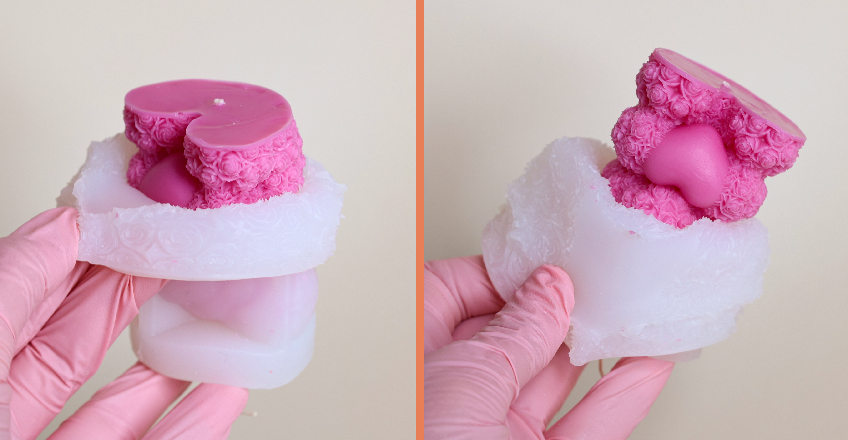 Następnie przejdź do wyjmowania świecy z formy: najpierw delikatnie odchyl krawędzie silikonu, a potem stopniowo wywijaj formę ku górze, aż świeca płynnie z niej wyjdzie.