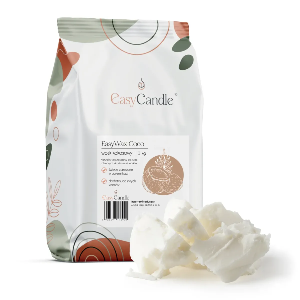 EasyWax Coco to miękki wosk kokosowy przeznaczony do zalewania świec w pojemnikach. Doskonale sprawdza się również jako dodatek do innych wosków - zmiękcza ich strukturę, poprawia jakość wypalania oraz zwiększa przyczepność do pojemników szklanych. Dodatkowo wygładza taflę (powierzchnie świecy) i znacząco poprawia oddawanie zapachu podczas palenia świecy.